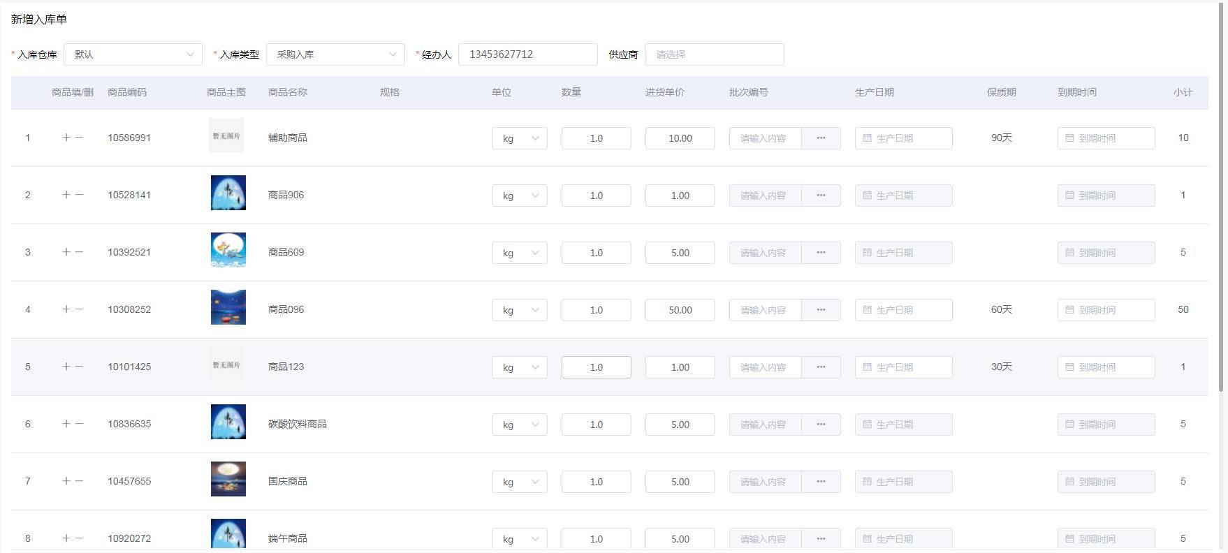 2.库存板块,新增单据,选择商品后页面显示优化,增加了商品的显示条数,便于查看和操作;